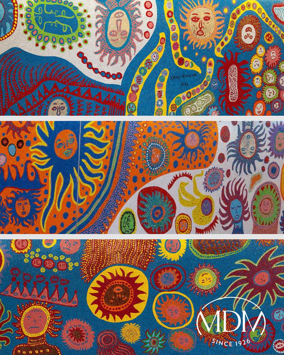 Measuring over 120 feet wide and 7 feet high (about 875 square feet / 81 square meters of mosaic), the work expands like a vibrant universe of light and matter, where Kusama’s language of dots, spirals, and cosmic visions is translated into glass, becoming eternal.