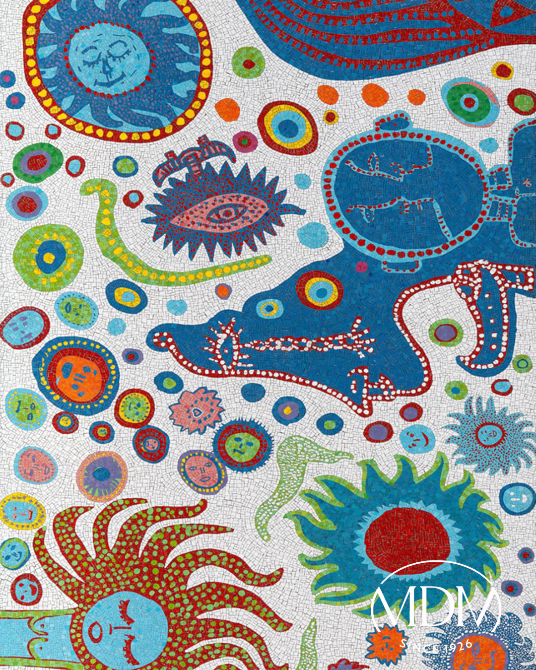 The glass tesserae — fused, shaped, and cut by hand using the centuries-old expertise of Murano artisans — create an explosion of forms and colors that seem to move like waves of pure energy.